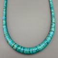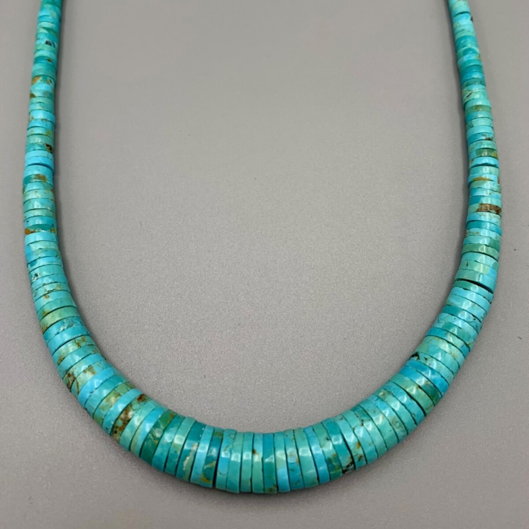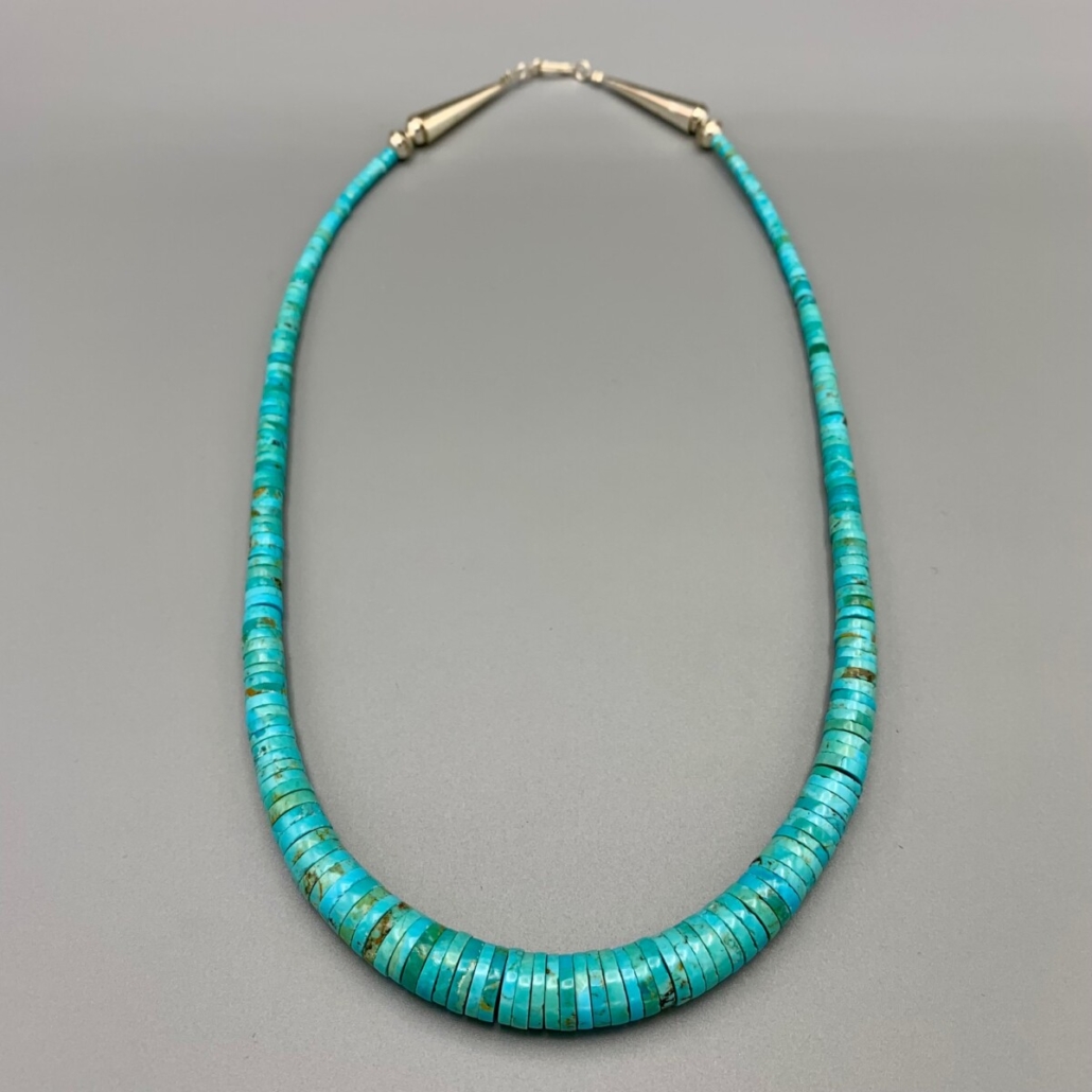 Kewa (Santo Domingo Pueblo) Traditional Beautifully Made Graduated Turquoise Heishi Necklace. Detailed with Sterling Silver Findings Including Beads and Tips